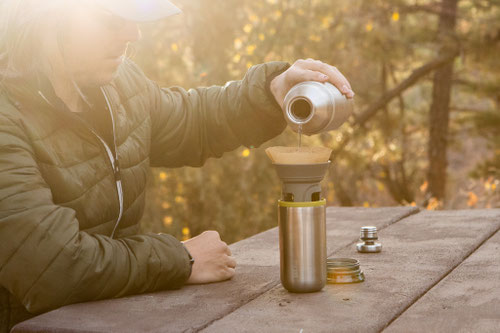 Ontdek de draagbare versie van het ontspannende koffiezetproces, de Cuppamoka! Gemalen koffie in het filter, water opgieten, even wachten en je neemt